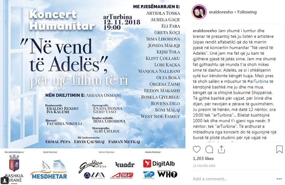 Koncertin humanitar do ta moderojë Arbana Osmani. Eraldo Rexho në një status në Instagram na ka njohur me artistët që do performojnë në këtë koncert.