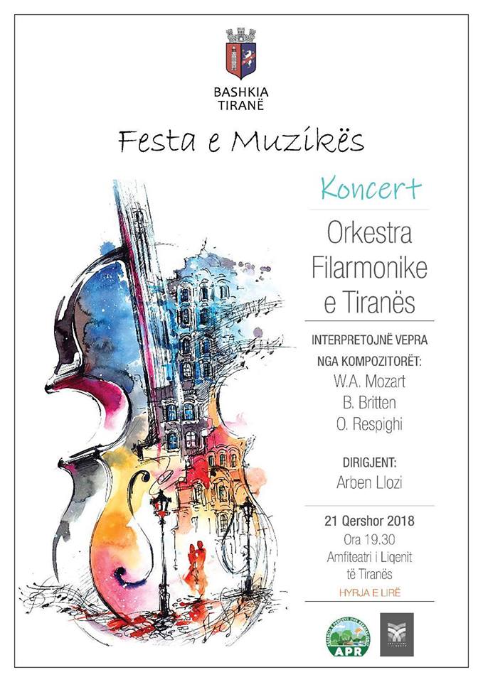 Festa e Muzikës si pjesë e projektit “Zërat e Bardhë”, mbështetur nga Ministria e Kulturës dhe Bashkia Tiranë do të ketë pjesë të programit dhe koncertin e Orkestrës Filarmonike të Tiranës. Nën dirigjimin e Arben Llozit do të interpretohen pjesë nga veprat botërore të W.A. Mozart, B. Britten e O. Respighi.