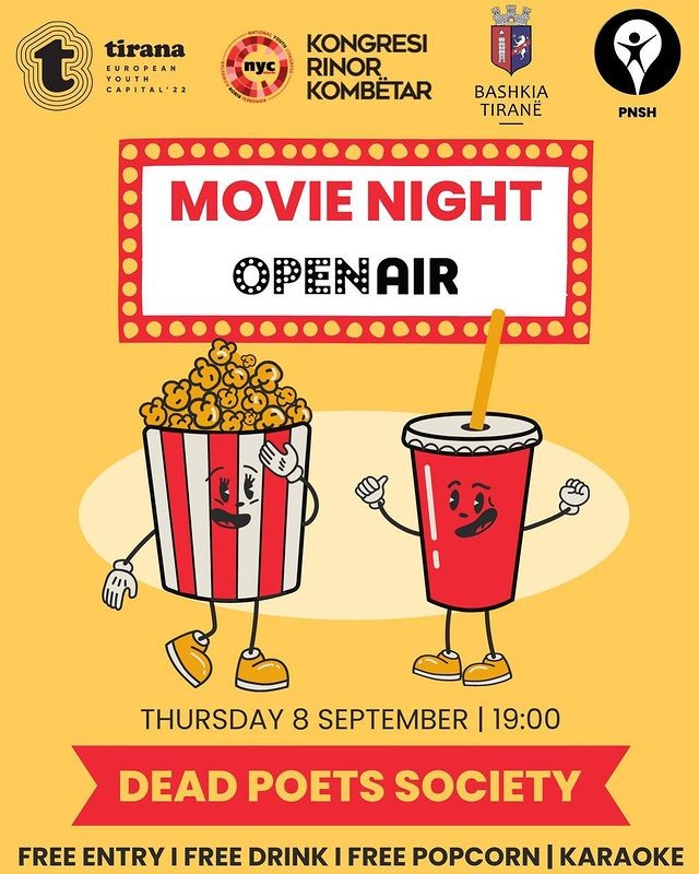 Projekti “Rinia në sytë e mi”, një aktivitet plot ngjyra do të çeli siparin e aktiviteteve me një Movie Night🍿 në ambientet e OPEN AIR TIRANA në 8 shtator ftojmë të rinjtë të bashkohen në një natë plot hare. 🥳 🎥 Hyrja fillon në orën 19:00